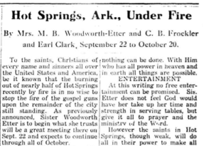 In 1913, a major fire devastated part of the town, but Goss declared “the burning out of half of Hot Springs recently by fire is no wise to stop the fire of the gospel guns upon the remainder of the city still standing.” [2] To add to the “fire” in Hot Springs, in 1913 famed revivalst Maria Woolworth-Etter and Cyrus B. Fockler (another early AG leader) showed up to hold meetings. [3] “Hundreds if not thousands” were being saved and filled with the Holy Ghost in Hot Springs.