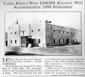 In the aftermath of the 1921 Race Massacre in Tulsa, many of the residential areas surrounding the Greenwood District were still in ruins. Into one of those spaces, the Tulsa KKK built a giant white building in 1923 at 501 N Main called Beno Hall. The new building that housed the 3,000 member klavern served as a constant reminder to the black community of Tulsa’s racial supremacy. From there, Klansmen terrorized the traumatized black citizens. It was also here that the “Tulsa Benevolent Society,” a front group for the KKK, oversaw the supposed rebuilding of the Greenwood area.