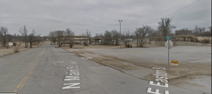 (The view north on Main. The empty lot is where Beno Hall/Evangelistic Temple once stood. The building in to the north is where the tent crusade took place in 1947. To the right is Standpipe Hill. To the south is Cain’s Ballroom.)