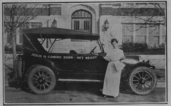 The meeting went 22 days and was wildly successful as the Assembly of God church doubled in size. McPherson was a rising star in the Pentecostal circles and her ministry lived up to her reputation. Many came to the Lord and were healed. One of McPherson’s strategies was to drive her “Gospel Car” around town in between meetings to pass out tracts and minister to people.