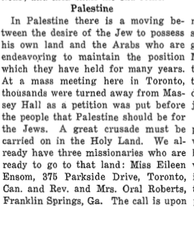 “Rev. G. Oral Roberts came before the Board having been called to labor in Palestine. The names of Mr. and Mrs. Roberts are being placed upon the list of our accepted missionaries for Palestine.”