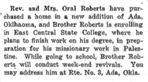 In January 1946, Roberts enrolled in East Central State College in Ada to prepare for his new found calling as a missionary to Palestine. He also traveled on weekends to to revivals to try to provide for his family