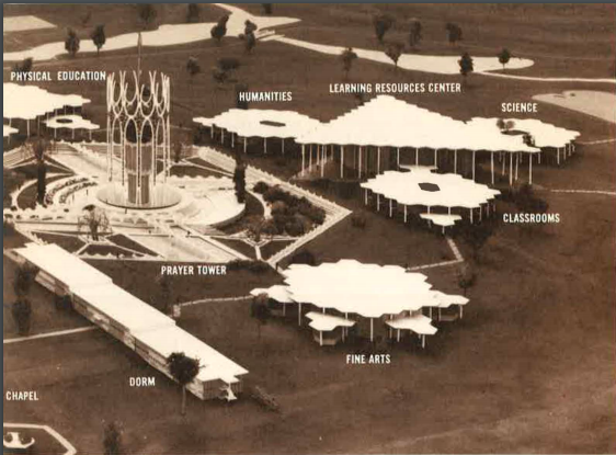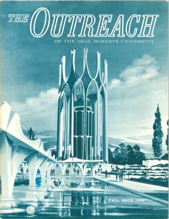 The first drawings of the proposed campus in 1964 were radically futuristic. See this cover of an early ORU magazine called “Outreach” featuring a crown-like concept of the prayer tower. I am sure the futuristic design seemed quite progressive to many of his old-time Pentecostal ministry base.