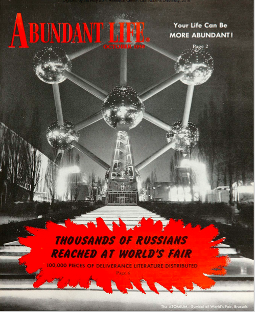 The connection to World’s Fair is supported by the fact that Oral went to several World’s Fairs in that era. As part of Oral Roberts’ growing literature outreach to the world, Oral sent an evangelistic team to the 1958 World’s Fair in Brussels Belgium. See the cover of the October 1958 Abundant Life.