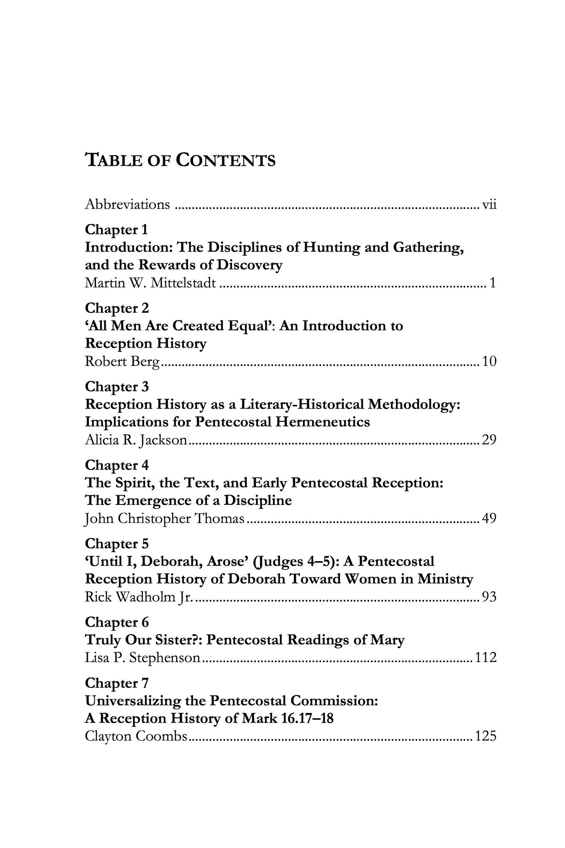 Martin Mittelstadt kicks off the volume with an editorial about the importance of Pentecostal Reception History. He provides a background context for the importance of this volume and discusses the essays that are included.