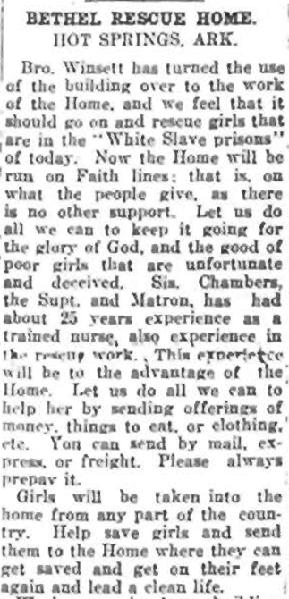 “In recent years, Pentecostal scholars have shown a particular interest in how Pentecostals have engaged in social issues. Among the social issues neglected in these conversations is the phenomenon of early Pentecostal engagement in working with victims of human trafficking and prostitution. Dubbed the “white slave trade” by social reformers in the late nineteenth century, organized efforts by both progressives and conservatives in American society campaigned to stop the sex trafficking of women across state lines. Advocates for legal reform of the “white slave trade” sought through laws and media campaigns to protect women from exploitation through prostitution and to preserve American culture during a time when the age of industrialization was producing social and racial anxiety.