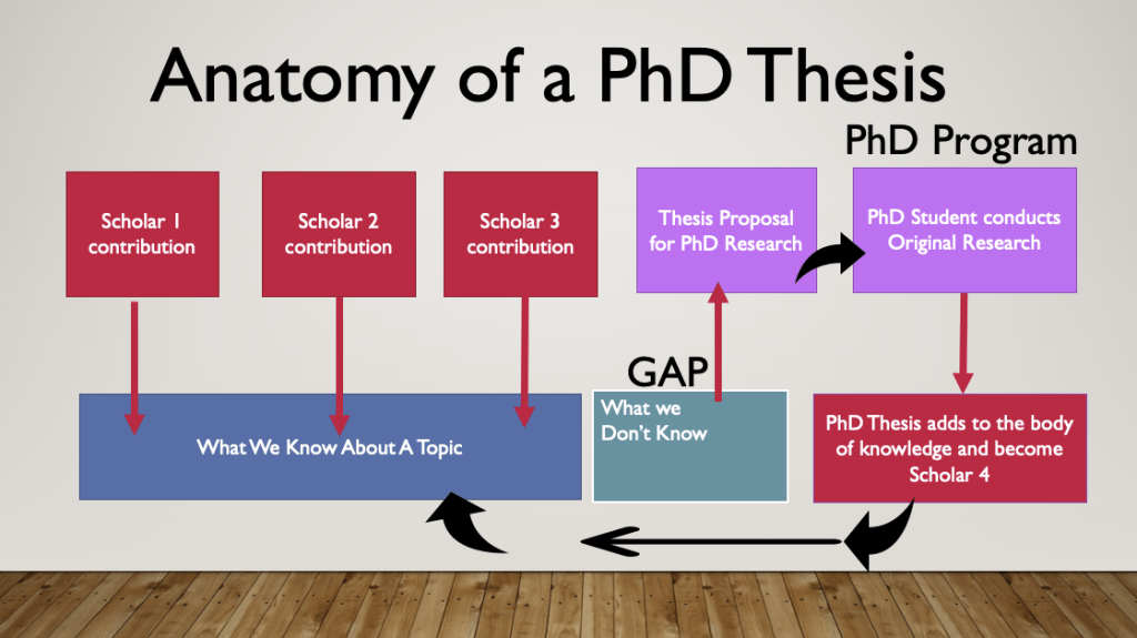 As previously noted, a PhD thesis is an original contribution to knowledge. That contribution must start with a literature review of what has already been said by scholars . From that baseline of information, the gap in research is established that asks a set of research questions that make the case for that a new study is necessary to fill the gap in that field. This rational becomes your research proposal.