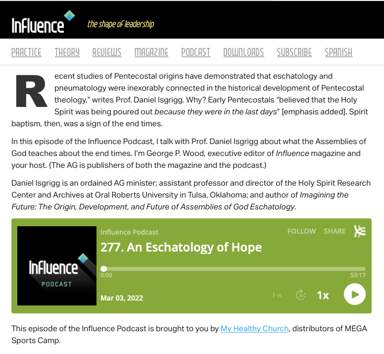 Earlier this week I was interviewed by George P. Wood, the Editor of the Assemblies of God magazine, Influence. We talked about my book and the history of AG eschatology. You can listen to this podcast, and the many other interesting interviews on the website or in your podcast apps.