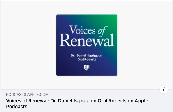 Voices of Renewal is a podcast from Regent University looking at the activity of the Holy Spirit of renewing the church throughout history. A few weeks back I joined Dr. Corne Bekker for a conversation about Oral Roberts and his role in renewal theology in the church. You can listen by clicking the image below or wherever you get your podcasts.
