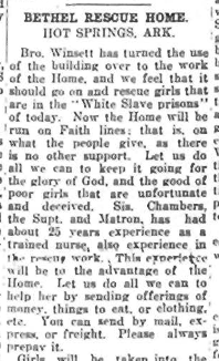 In 1913, a rescue home was opened in Hot Springs Arkansas where Howard Goss and E.N. Bell joined the work as trustees and solicited help from readers to save girls from “White Slave prisons” and give them an opportunity to “get on their feet again and lead a clean life.” The home was part of the growing pocket of Pentecostals in Hot Springs, which hosted the first Assemblies of God General Council just a few months later in April 1914. Unfortunately, in their passion for joining the cause, these white Pentecostals adopted the racist language of “white slave” narratives.
