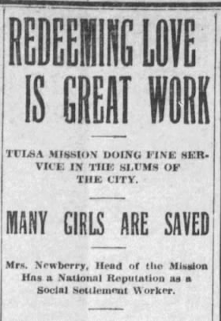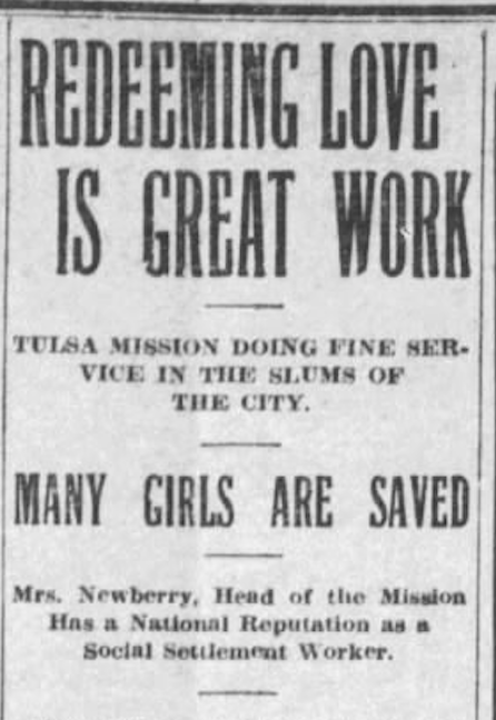 Also, as told in my book Pentecost in Tulsa, The Mission of Redeeming Love in Tulsa was started in 1910 and by 1913 became a Pentecostal mission led by Minnie B. Hiland. Like many of these early rescue missions, Mission of Redeeming Love worked with the “erring, and betrayed, and outcast girls from the dark and cruel places of sin in Tulsa.” (Tulsa World, Dec 12, 1913). One of the testimonies of the girls in the home is as follows: “I am really and truly and wonderfully saved and have given my heart and soul to the Lord. The sisters in charge of the home are so kind to me that I cannot keep from loving them.”