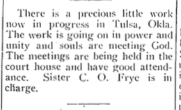 Not long after Parham’s campaigns, Frye leased a small former Methodist Episcopal Church building at 2nd and Cincinnati to hold meetings three times a week. But she did not assume the preaching duties.[6] Instead, Frye reports, “People wonder how we have such meetings without a preacher, but when they come out, they see that we have many preacher[s], and the best of all we have the power of the Holy Spirit in all our meetings.”[7]
