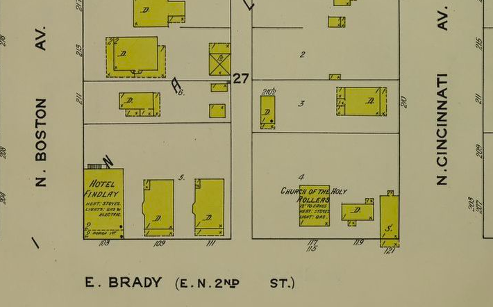 Finally, the Apostolic Faith Mission leased a lot on the corner of Brady and Cincinnati, at 115 E. 2nd Street/Brady, the current site of the Guthrie Green. They built a small frame 20″ x 40″ building where they would hold their meetings. The city officials nicknamed it the “Church of the Holy Rollers.”