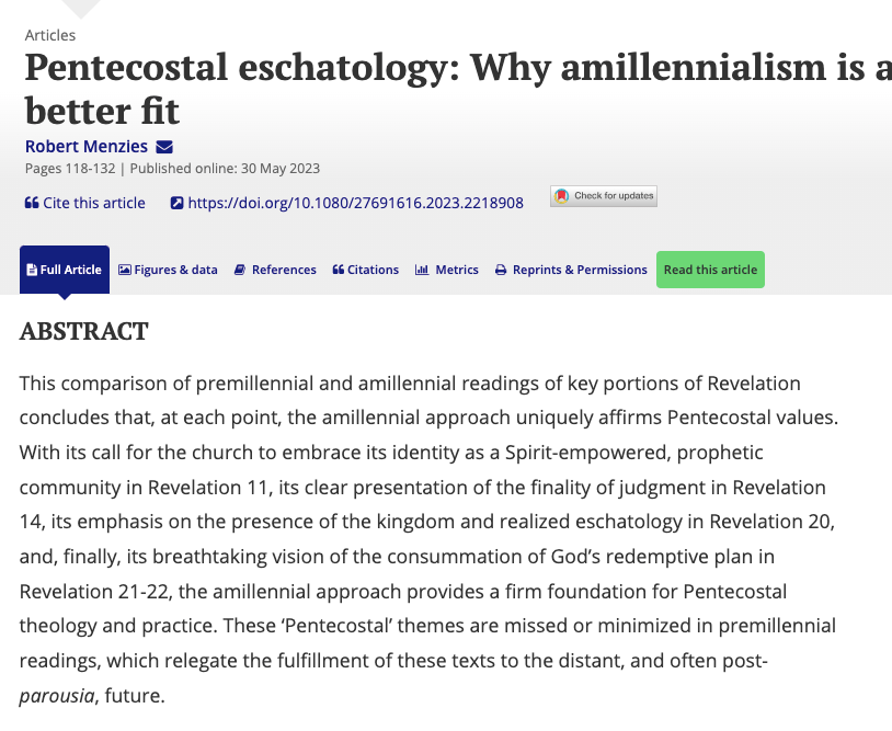 Menzies, however, has continued to publish his objections to premillennial positions in the AG. In the Summer of 2023, Menzies sent me his article published in the Journal Pentecostal and Charismatic Christianity (article here) in which he furthers his fight for amillennialism. In this latest piece, “Pentecostal Eschatology: Why Amillennialism is a Better Fit,” he attempts to interpret key scriptures in Revelation to show how amillennial interpretations are more faithful to Pentecostal concerns than premillennial interpretations. These conversations I welcome, particularly in the academy.