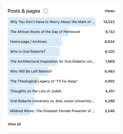 As you can see, the top result is my blog on the “mark of the beast.” This is the post that drives a lot of people to my blog. It is clear that this post resonates with the anxiety people feel about future. It is also clear that my work on Oral Roberts is a big draw to the blog.