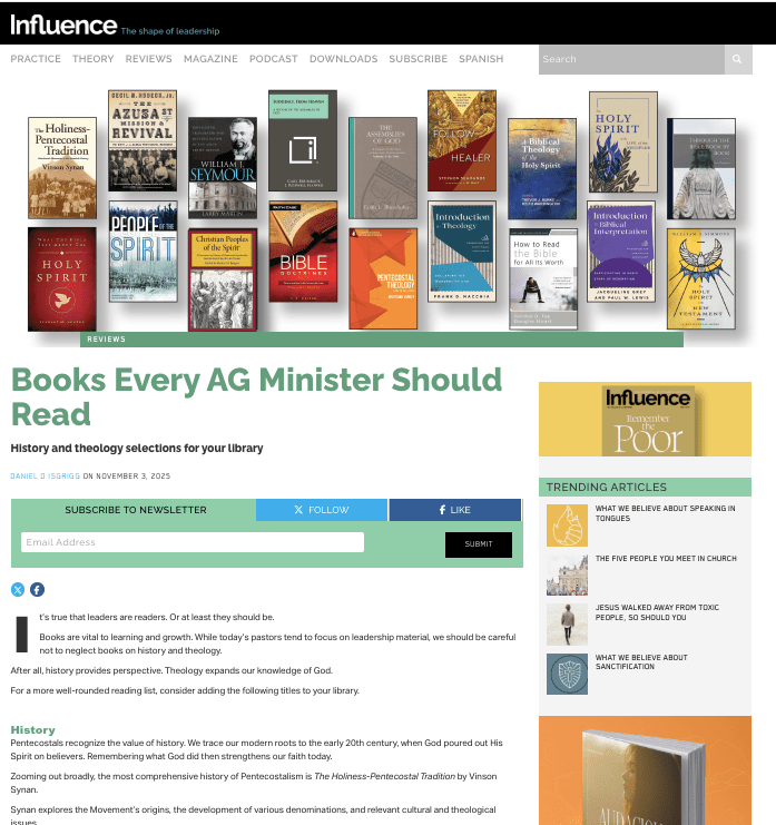 A second article was published this fall called “Books Every AG Minister Should Read.” This article discusses various historical and theological books on Pentecostalism that I would recommend to ministers to have in their library. From popular books to academic works, these books are helpful in developing a sense of the ethos of Pentecostal theology and history. You can read the article here.