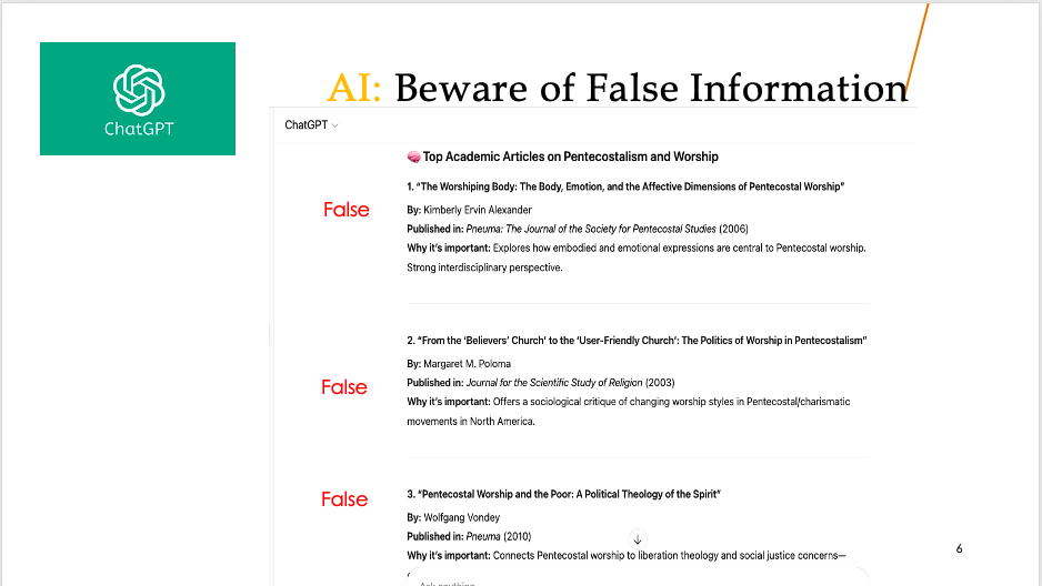 But there are also big pitfalls for academic research. AI is notorious for creating sources that do not exist. This happens regularly with tools like ChatGPT, which hallucinates sources if it does not have a good answer. Below is an image of when I asked ChatGPT for a list of the top academic sources on Pentecostal worship. Every one of them was false. Unfortunately, students are citing sources that do not exist because they used AI as a shortcut.